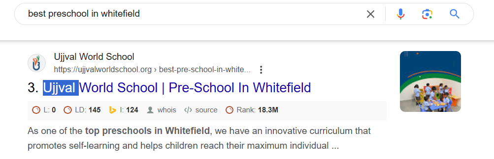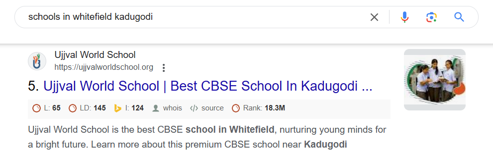 To improve Ujjval World School's online visibility and organic search rankings for targeted keywords related to schools in the Whitefield and Kadugodi areas of Bangalore.